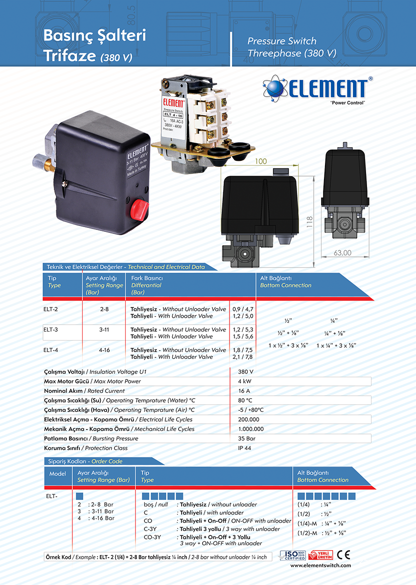 Element basınç şalterinde 2 bar’dan 16 bar’a kadar çalışma basınç seçeneği sunmaktadır. Basıncın yükselmesi veya eksilmesine bağlı olarak sinyal devresi vermektedir.